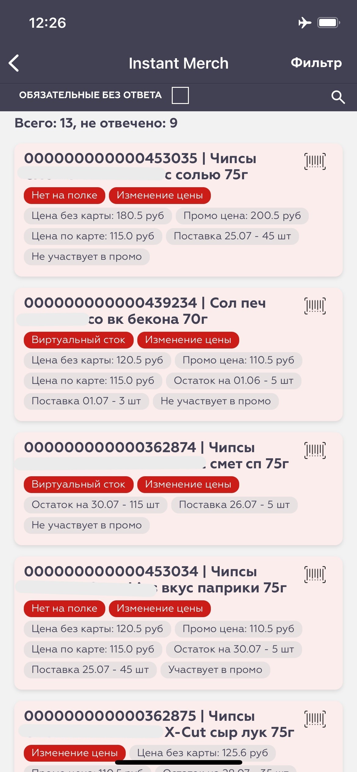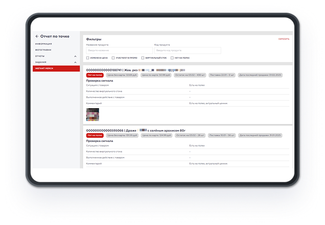 Актуальные матрицы, корректность ценников, старт и параметры промо — все эти данные доступны в едином окне. INSTANT MERCH позволяет видеть ситуацию в разрезе каждой ТТ и оперативно реагировать на любые отклонения.
